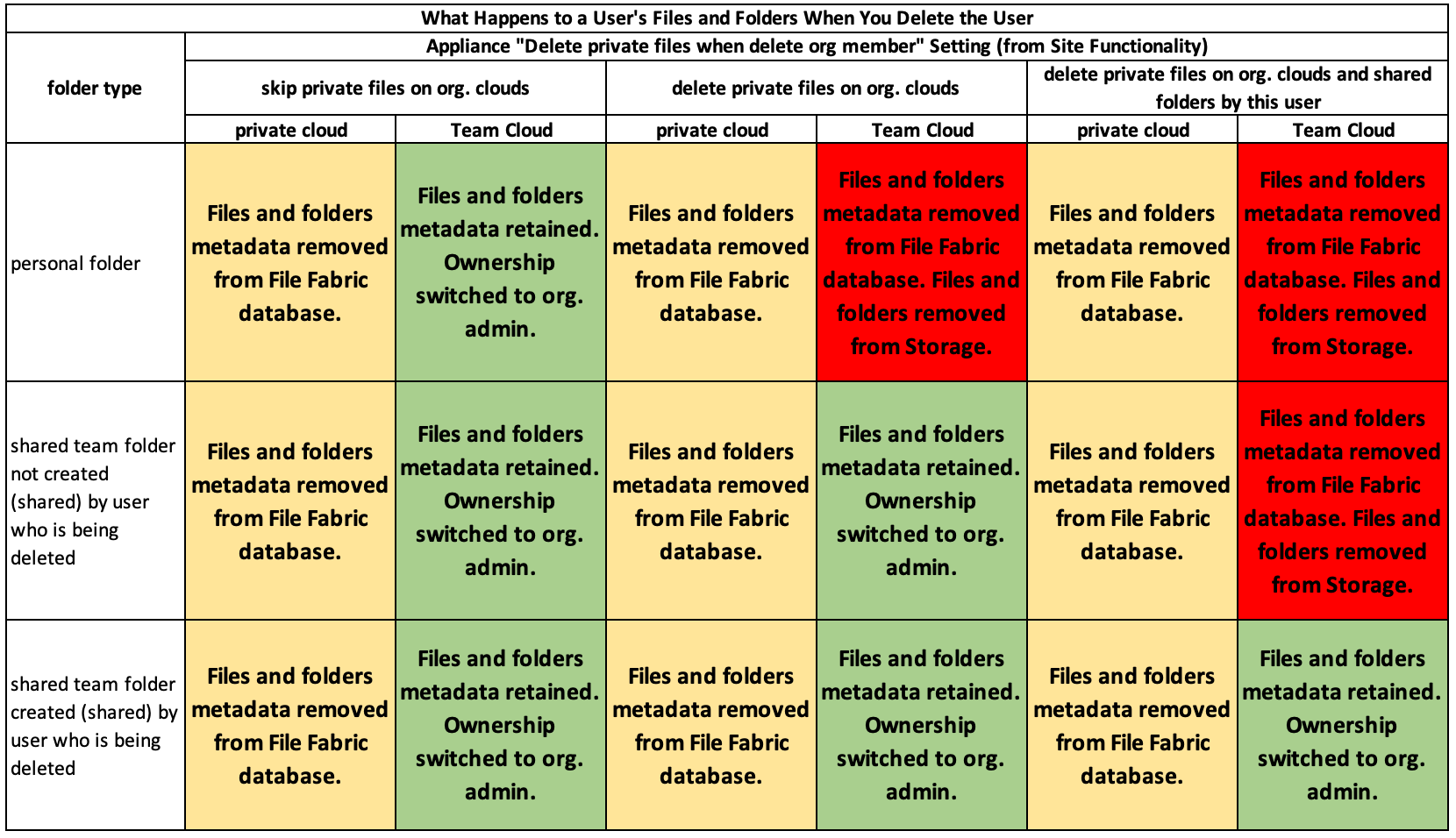 What happens to an org. member's files and folders when the member's user account is deleted depends on whether the folders are personal or shared, whether they are on a personal provider or on a Team Cloud, and how Access Anywhere's deletion policy has been set by the appliance administrator. This table summarizes the possibilities: