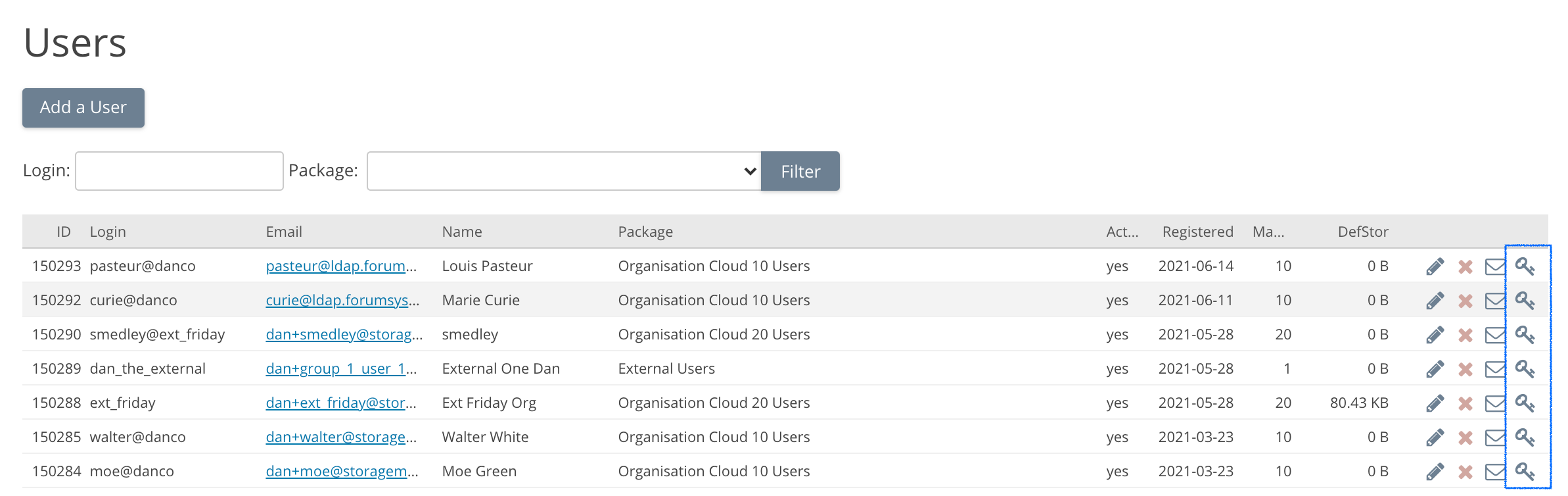 To log in as a different user, the administrator first logs in as herself and then clicks on the key icon in the row representing the user on on the Users page (for appliance administrators):