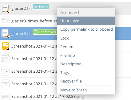 To access a file that is archived on either Glacier or Glacier Deep Archive, you can click on its download icon in the File Manager or highlight the file and Select “Unarchive” from the file's right-click menu.
