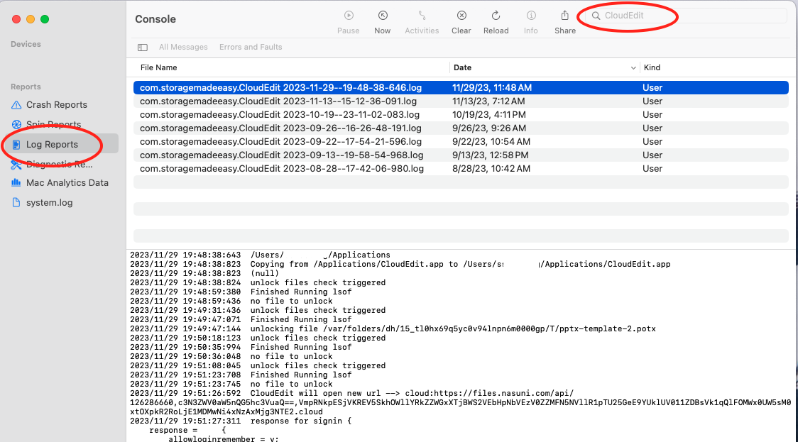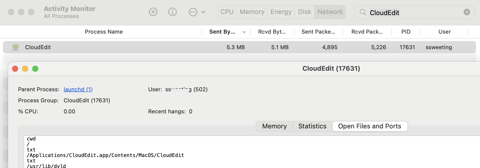 If you have multiple Cloud Edit applications installed, to see which one is running first open up Activity Monitor. Search for “CloudEdit” and then double-click to open the detail dialog. From there select the tab “Open Files and Ports”.