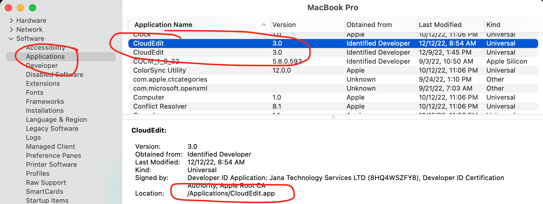 You can find CloudEdit apps that are installed on a Mac by navigating to “About this Mac” → “System Report” → Software → Applications. This view also shows what versions the apps are.