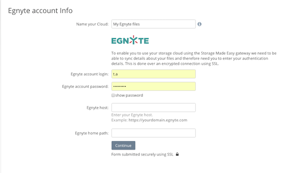You need to authorise Access Anywhere to access your Egnyte account. To do this you need to enter your account username, password and Egnyte host. Access Anywhere uses this information to ask for access to your Egnyte account on demand. All authentication data is stored encrypted, with the encryption key being stored in a separate key server for security.