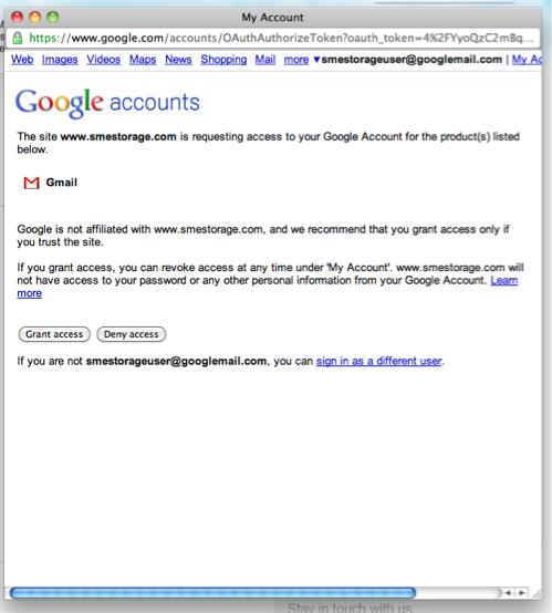 Access Anywhere can use Gmail OAuth for delegation access. You are taken to you Google Account and asked to grant access for to be able to interact with your Google Mail.