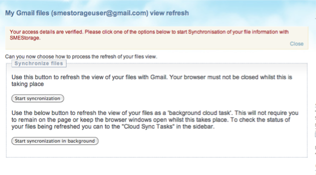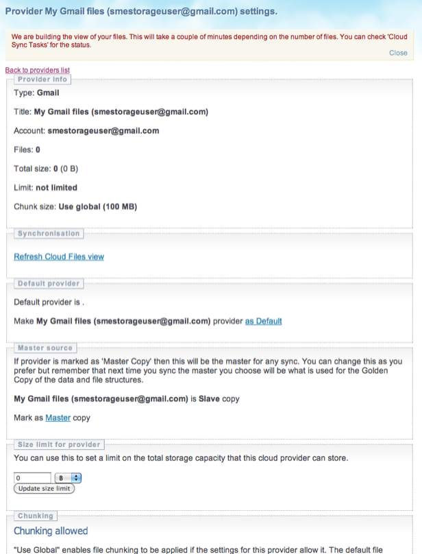 Once the account has been verified you can perform an initial meta-sync. This syncs the details of the Gmail attachments (filename, extension, date etc) and builds the virtual cloud file system view.