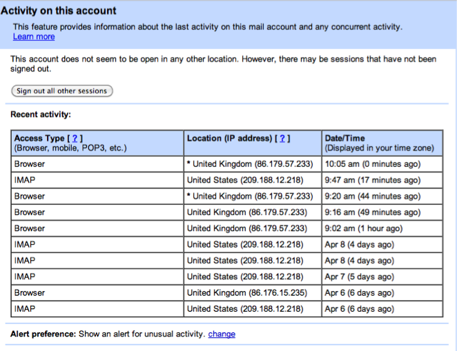 You can see that your account has been accessed by the service by logging into Gmail and looking at the 'Last account activity'. This will show the IP 209.188.12.218, the Access Anywhere.com IP address.