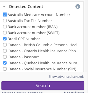 When searching by content detectors, tick the detectors for the kinds of matching content for which you want to search: