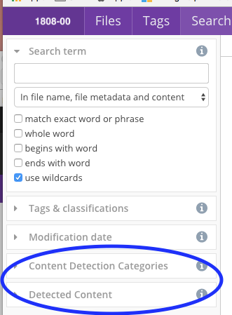 To search for files with matching content use either or both of the Content Detection Categories control and the Detected Content control on the File Manager’s Search tab: