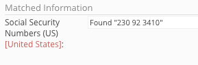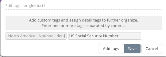 When matching content is detected in a file, a category tag is added to the file metadata indicating the type of content that was detected. For example, if Access Anywhere is configured to scan for US social security numbers as part of the “North America - National Identifiers” Content Detection Category, and one or more matching data values are found by the social security number detector when the file is scanned, then a tag with the value “US Social Security Number” will be added to the file's metadata under the “North America - National Identifiers” classification.