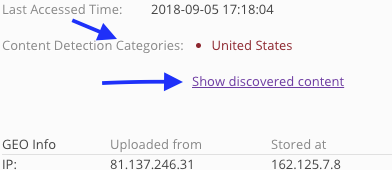When the File Manager’s Info pane is shown for a file that contains matching content, the Classifications (Content Detection Category names) and Tags (content detector name) for the matching content that was found in the file are displayed for administrators and those in the Content Discovery role.