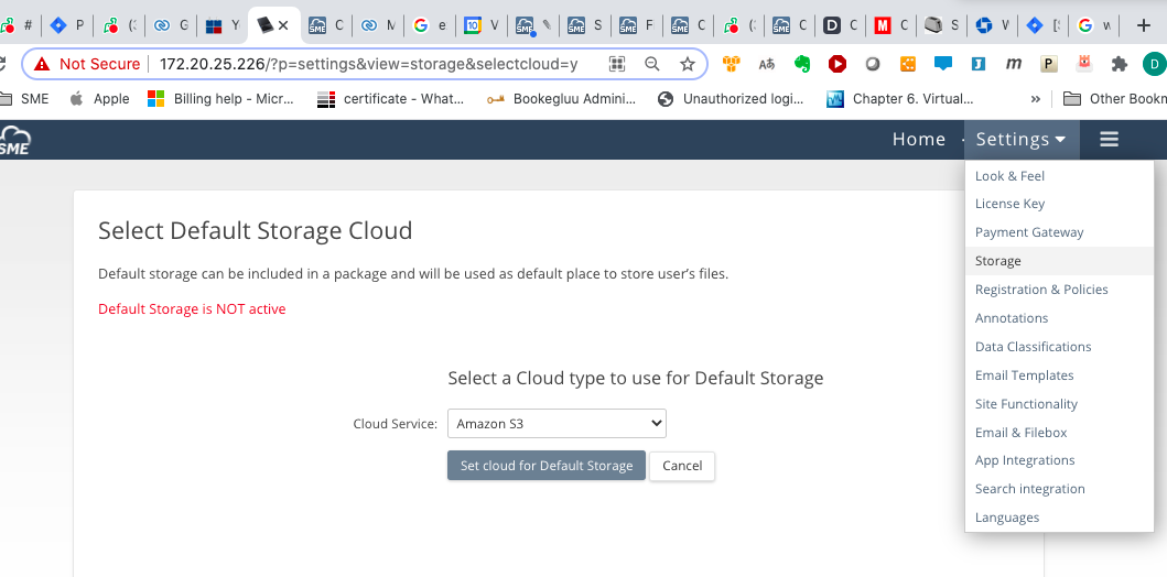 - Storage must be configured for the External Users if they will be allowed to upload files. Appliance Default Storage must be used for this purpose. Appliance default storage can be configured by the appliance administrator on the Storage page which is accessed from the settings menu: