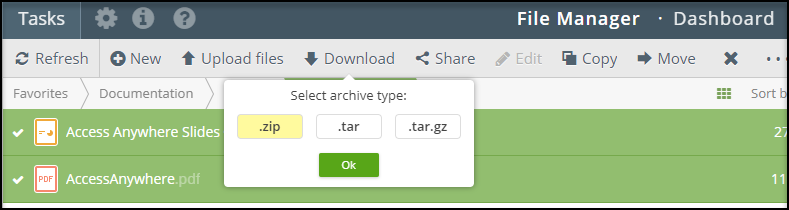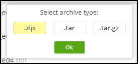 The Web File Manager allows downloading a folder's content into a range of archive formats. The following archive formats are supported: