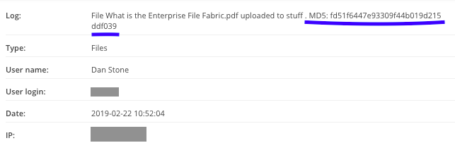 Access Anywhere can now calculate the MD5 hash values of files as they are being uploaded for integrity protection. The hash value is presented in the Audit Log entry for the upload as a means of verifying the authenticity of a file.