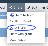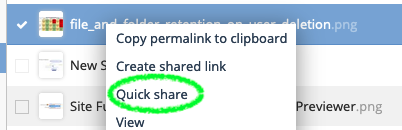 Quick sharing is available for files (not for folders). When this configuration option is set to No then the user who is creating a link will see the sharing dialog. When it is set to Yes and the organization's sharing policies do not require that the user set any values for new links, then users will find a “Quick share” option on the file context menu: