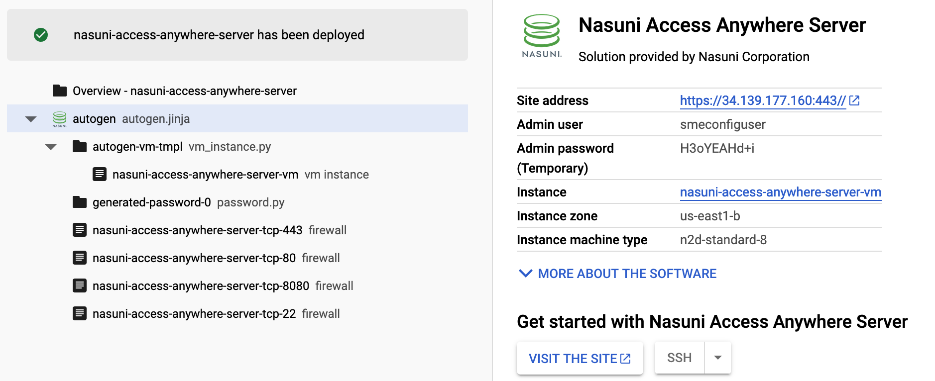 If you don't have the deployment panel, first open the Google Cloud Console. From the top left hamburger menu (aka Navigation menu) go to the page Compute Engine > VM instances. If you don't see the Access Anywhere server instance check the project you are viewing. Open the VM instance details and locate the External IP under Network interfaces.