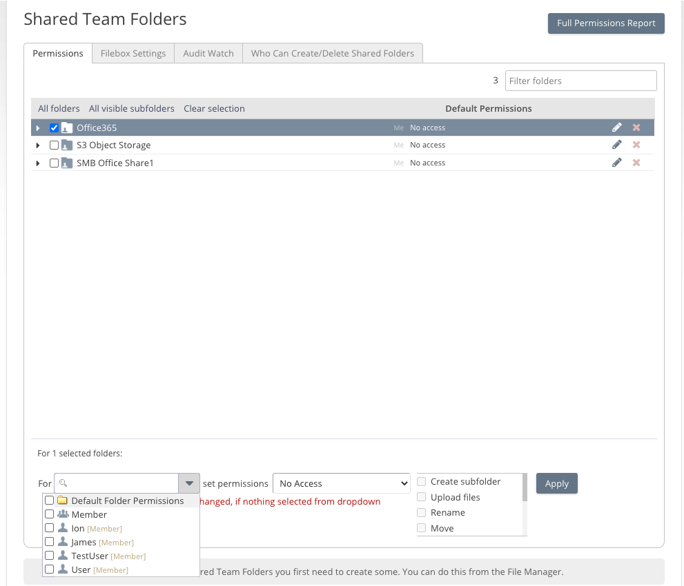 Once shared folders for the Cloud File Server have been added, the Cloud File Server Admin can control access to folders and sub folders using an access control list. If a user has no permission to a folder the folder is not displayed at all in their file tree.