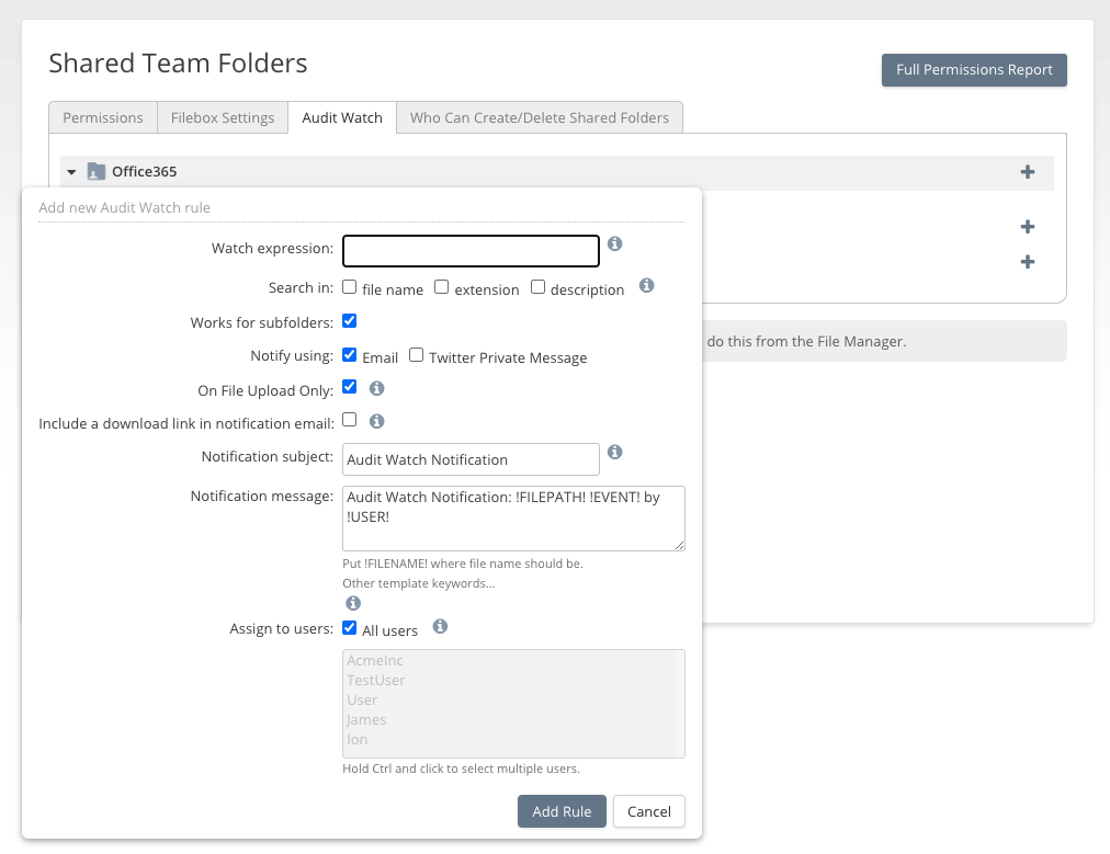 The Access Anywhere Admin can setup Audit Watch notifications. Notifications are based upon rules that are invoked on file events. If a file of a certain description, file name or extension is uploaded, updated, viewed etc, then the nominated users can receive notification alerts.