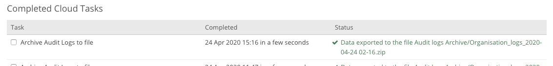 If you proceed a background task will be created which will create a zip file containing the audit log entries. If you care to inspect the background task, find its entry on the Tasks tab of the File Manager page: