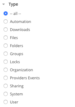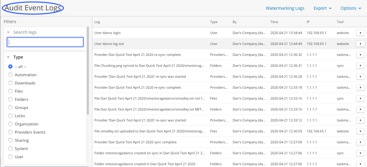 Event logging is built into Access Anywhere and it works above any storage provider that is mapped to Access Anywhere. Which types of events are logged can be controlled by the org. admin from the Security tab of the Policies page: