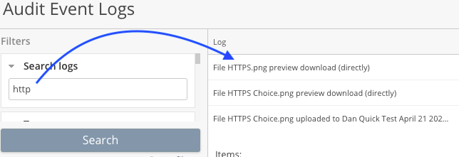 The Access Anywhere provides a Watermarking feature that affixes a random watermark code to downloaded PDF files. You may sometimes want to learn the details of when a watermarked file was downloaded. To do this, click on the Watermarking Logs link near the top of the Audit Event Logs page: