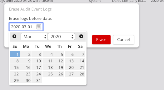 When you erase audit log entries, only entries from before a date that you select will be erased: