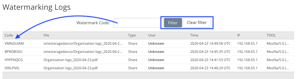 When this page loads it displays a list of all watermarked file downloads in reverse chronological order. To search for downloads for files with a specific watermark code, enter some or all of the code in the Watermark Code text box and click on Filter. The text you entered will be used without regard for case to filter the watermark downloads by the code in the first column. You can clear the filter with the “Clear filter” button.