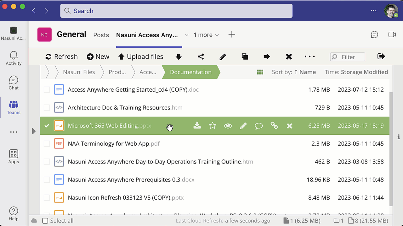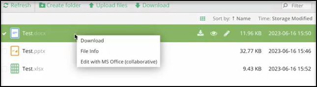 To collaborate on a file through Microsoft Teams, select a file and from the right-click menu, select Edit with MS Office (collaborative). A new browser window opens, allowing the file to be edited.
