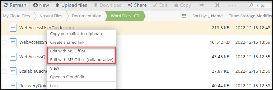 To edit in the co-authoring mode, right-click on a document and select Edit with MS Office (collaborative).