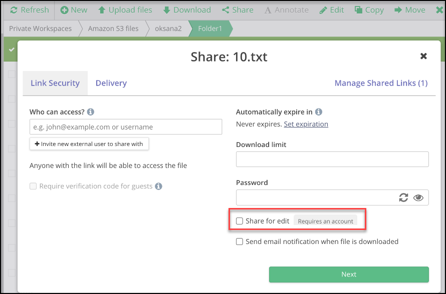 To share a file and allow others permission to collaborate with you in real-time, check the Share for edit option while creating your secure share link.