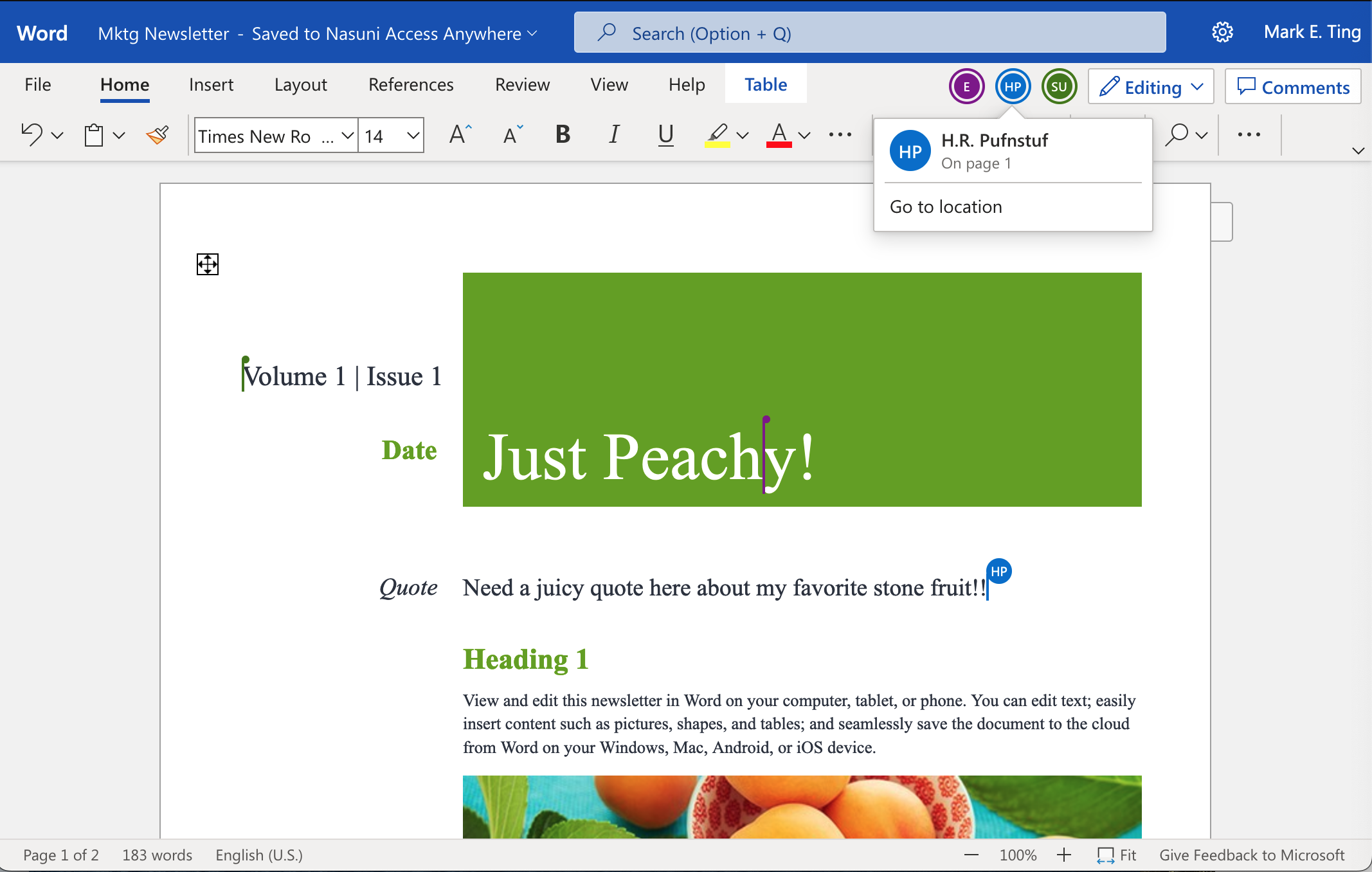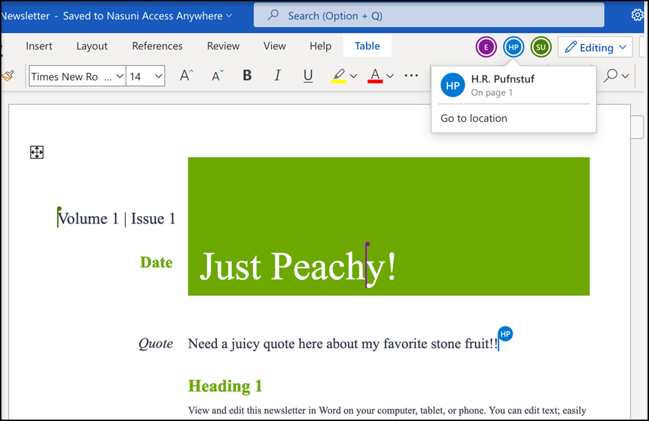 During a co-authoring session, all users work simultaneously on a document and can view edits from other users in real time. After the last person closes the document, the editor seamlessly saves the changes back to your Access Anywhere account.