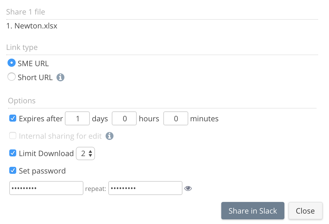 The integration for Slack provides you with a secure method of sharing files inside Slack from your Nasuni storage. You can share files directly within Slack, and set security controls on how long the file can be shared for, the number of times the file can be accessed, and add password protection to access the file.