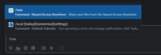 To begin connecting your Slack account, type /naa in a chat or channel within your Slack workspace. Simply type it as follows: