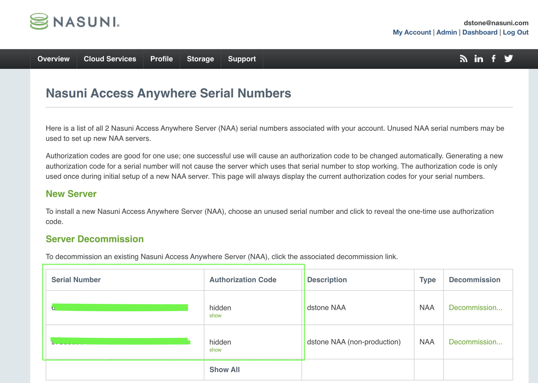 To get the serial number and Authorization code, log in to https://account.nasuni.com and choose “NAA Serial Numbers”.