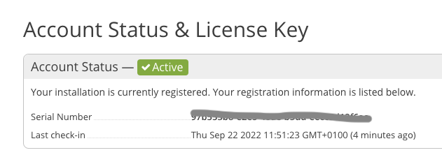 When you acquired your serial number you should have acquired an authorization code at the same time. Paste them into the labelled boxes in the Account Status box, and press “Save”. If the values you provided were correct, the Account Status box will look like this: