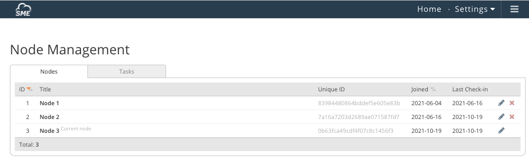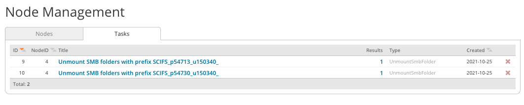 When a node is removed from the nodes list, the history of tasks that were run on that node (more on this later) is removed from the database. Although nodes add themselves to the list, they are never removed automatically. This prevents nodes that are briefly unavailable from being removed and their task history being lost. The appliance administrator can remove any node from the list except the node that is labelled “Current node” by clicking on the red 'X' next to the node entry on the list.