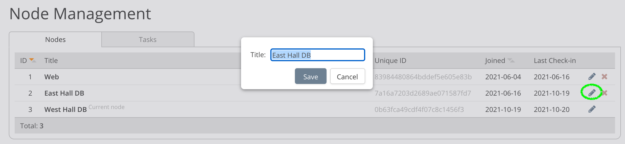 When a node registers with the Access Anywhere database it is assigned a default name (title) consisting of the word “Node” followed by a space and the node's ID. Administrators can rename a node by clicking on the pencil icon to open a renaming dialog box.
