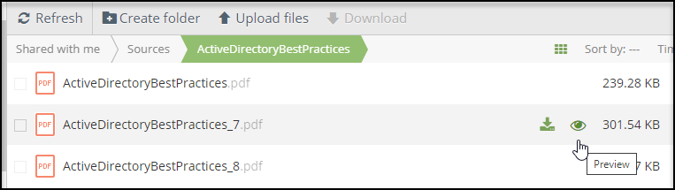 Every shared file provides the recipient with a way to preview the file’s contents and a set of actions. To view a file preview, hover over a file from the list and click the in-line Preview icon.