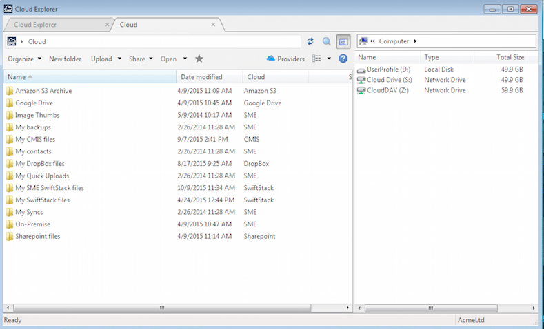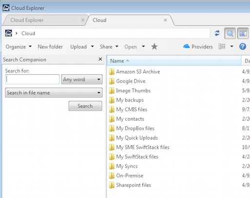 Double clicking the Cloud Files icon brings up the Cloud Files tab. Here the files and folders from the cloud storage providers that you have mapped to your account will be visible and can be manager using the toolbar at the top of the tab.