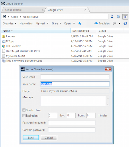 You can share a file over email from the Cloud DashBoard by either right clicking on a file in the Cloud Files view, and choosing to share over email or selecting a file and using the sharing icon to choose the option to share a file over email.