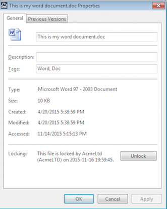 Right clicking and choosing 'file properties' in the 'Cloud Files view' from the Cloud DashBoard. This will show meta information about the file. It also show whether the file is locked. Locking a file means that it cannot be accessed until it is unlocked. This is useful for when you are editing a file and do not want to make it available.