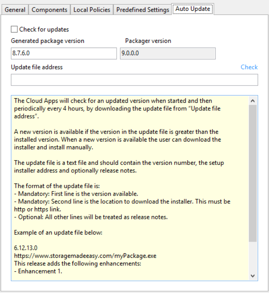 - Enter the URL for the text file in the field: “ Update info file address” In the Packager.
